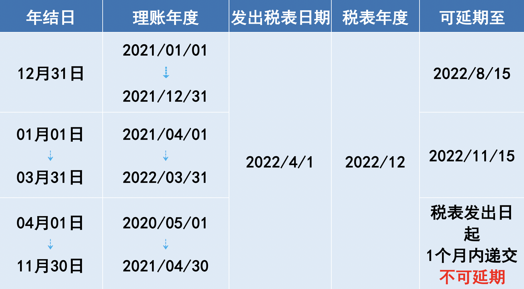 根據(jù)企業(yè)年結(jié)日選擇的不同,其收到稅表后可允許延期辦理的時限也會有所不同。相關(guān)的對比可在下表的舉例中來辨別。