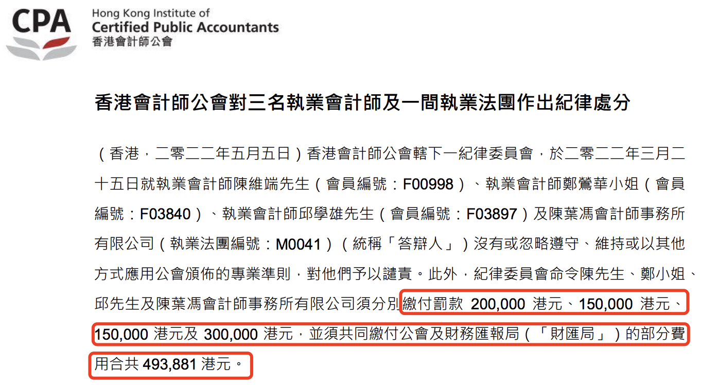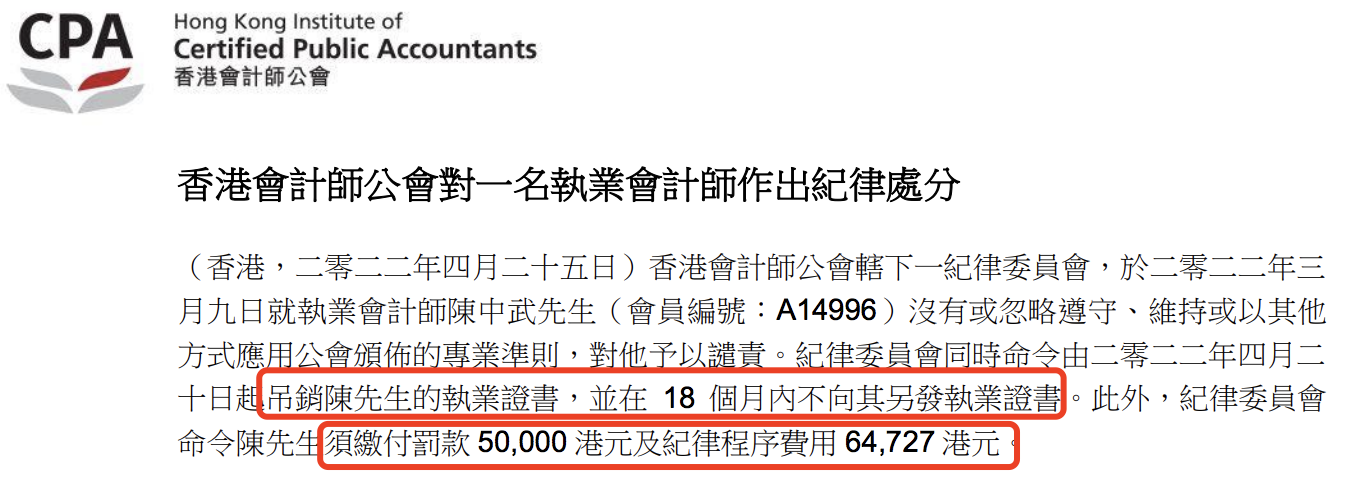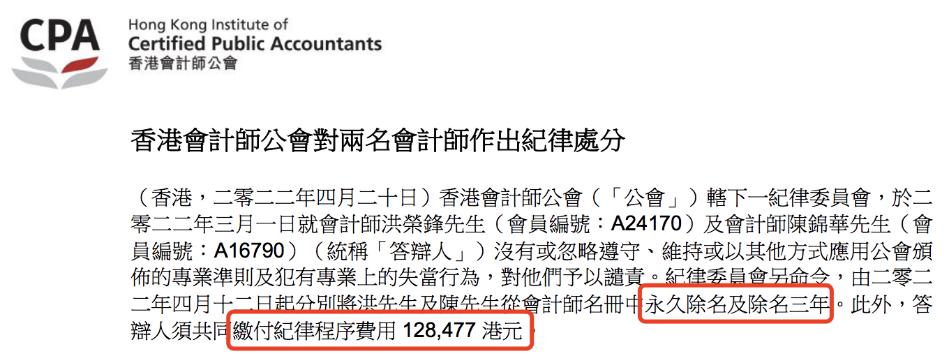 據(jù)香港會計師公會公開的信息顯示,僅2022年上半年內(nèi),香港就有多間會計師會所及數(shù)位相關會計師因違規(guī)被予以譴責和處款(包括吊銷執(zhí)業(yè)證書、除名和罰款):
