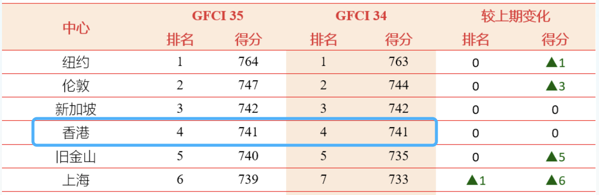 該指數(shù)從營商環(huán)境、人力資本、基礎(chǔ)設(shè)施、金融業(yè)發(fā)展水平、聲譽(yù)等方面對全球121個(gè)主要金融中心進(jìn)行了評價(jià)和排名。其中,香港總排名維持第四位,整體評分741分。