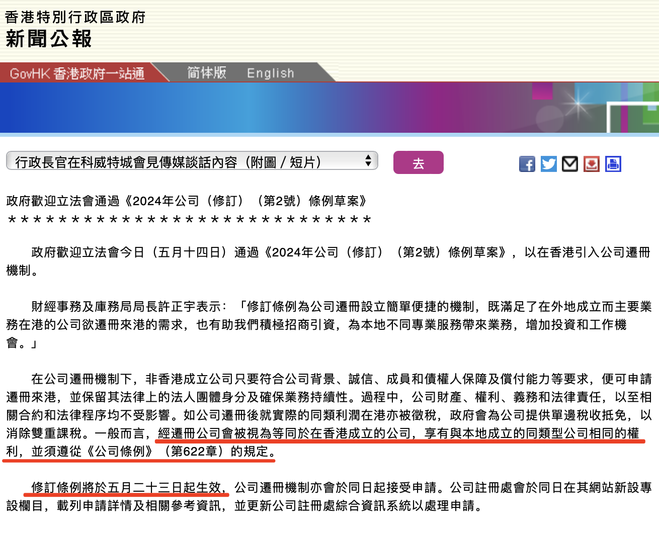 從2025年5月23日起,符合條件的境外公司可直接將注冊(cè)地變更為香港,同時(shí)保持其法律身份和業(yè)務(wù)連續(xù)性的完整。