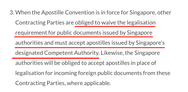 即當(dāng) Apostille 公約對(duì)新加坡生效時(shí),其他締約方有義務(wù)放棄新加坡當(dāng)局簽發(fā)的公共文件的合法化要求,必須接受新加坡指定主管當(dāng)局簽發(fā)的 apostilles。同樣,在適用的情況下,新加坡當(dāng)局將有義務(wù)接受加注以代替來(lái)自這些締約方的外國(guó)公共文件的合法化。