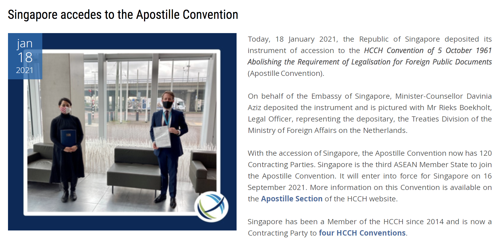 ?新加坡早前于今年1月份提交的《廢除外國(guó)公共文件合法化要求》(Apostille 公約)的加入書(shū),已經(jīng)由新加坡法律學(xué)會(huì)(The Singapore Academy of Law)負(fù)責(zé)驗(yàn)證并核發(fā)海牙認(rèn)證。目前,該公約已于 2021 年 9 月 16 日對(duì)新加坡生效。