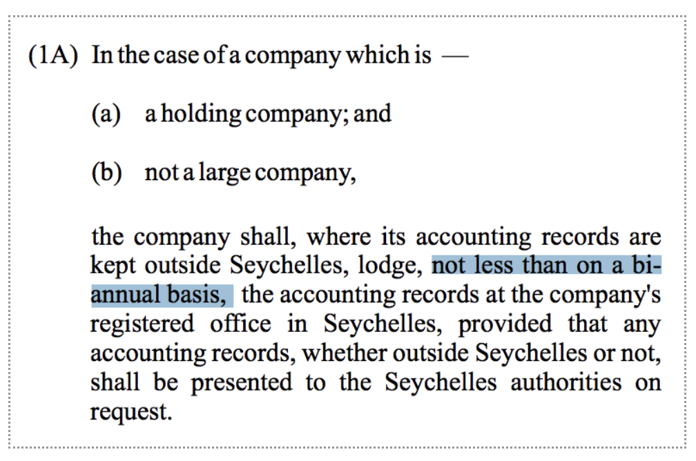 每半年向注冊辦事處提交一次會計記錄(《修訂法案》第175(1a)和(1b)節(jié))。登記冊上的所有公司必須每半年提交一次會計記錄,并將其保存在塞舌爾的注冊辦事處。