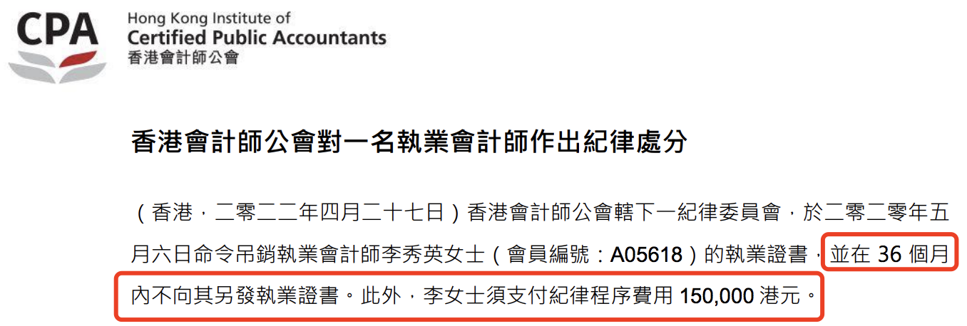 據(jù)香港會計師公會公開的信息顯示,僅2022年上半年內(nèi),香港就有多間會計師會所及數(shù)位相關(guān)會計師因違規(guī)被予以譴責(zé)和處款(包括吊銷執(zhí)業(yè)證書、除名和罰款):