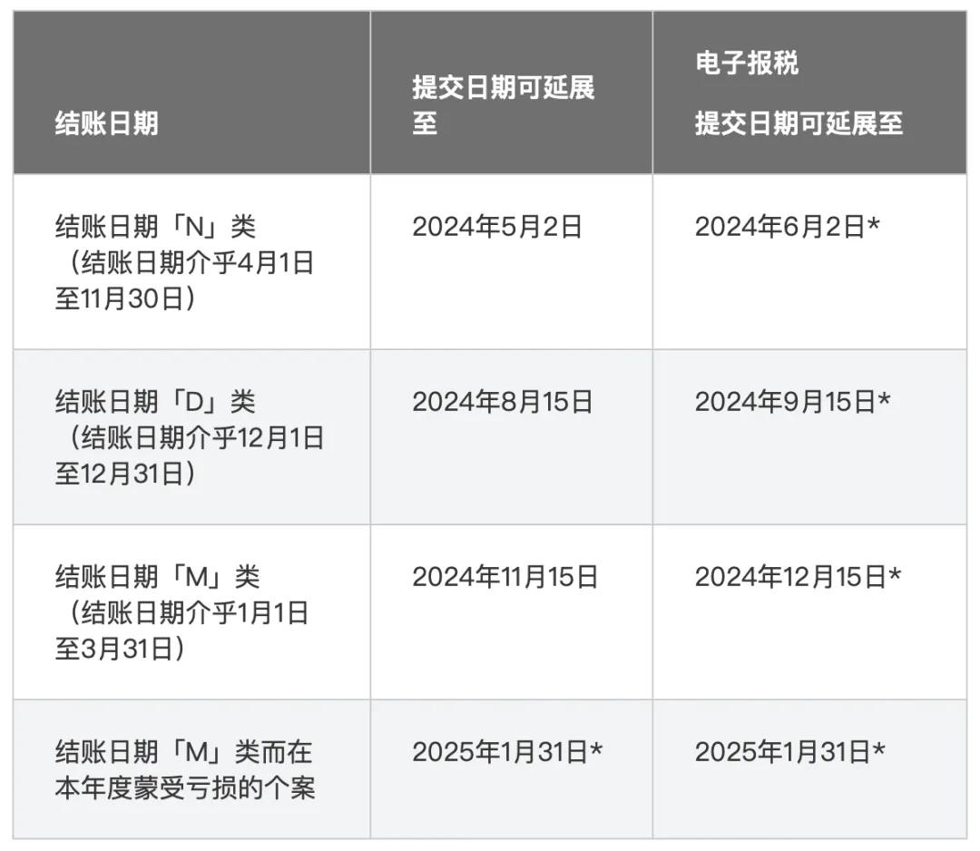 我們上文說,公司需要在收到稅表的一個(gè)月內(nèi)完成填報(bào)。但在實(shí)際申報(bào)過程中,若你的稅務(wù)代表在整批延期計(jì)劃下辦妥申請(qǐng)延期提交你的2023/24年度利得稅報(bào)稅表,則提交期限通常延展至下述日期: