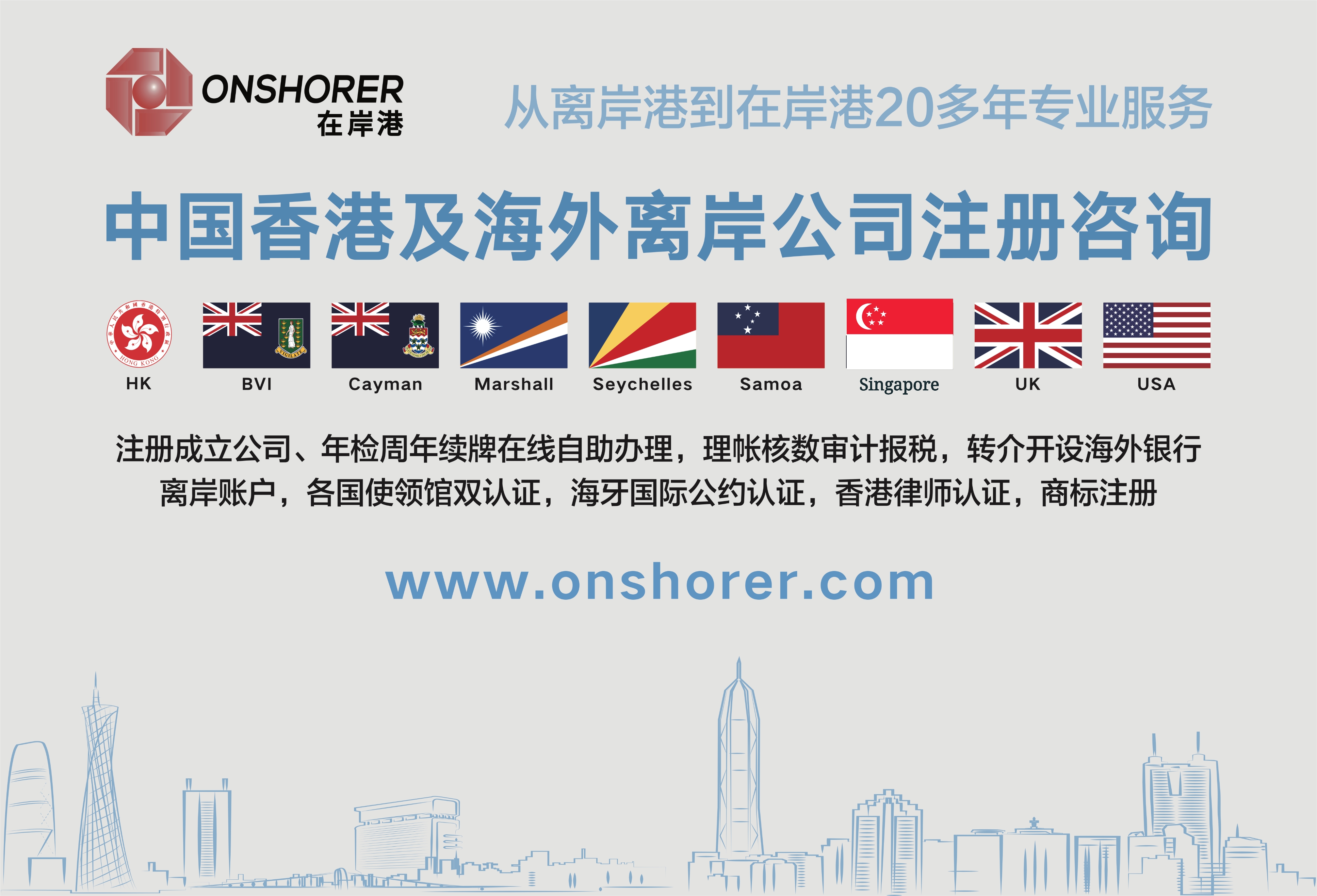 不論是注冊(cè)成立海外公司、海外銀行開戶,還是商標(biāo)注冊(cè)、版權(quán)服務(wù)和文件認(rèn)證等相關(guān)的商務(wù)難題,在岸港都能夠給予專業(yè)的解答。