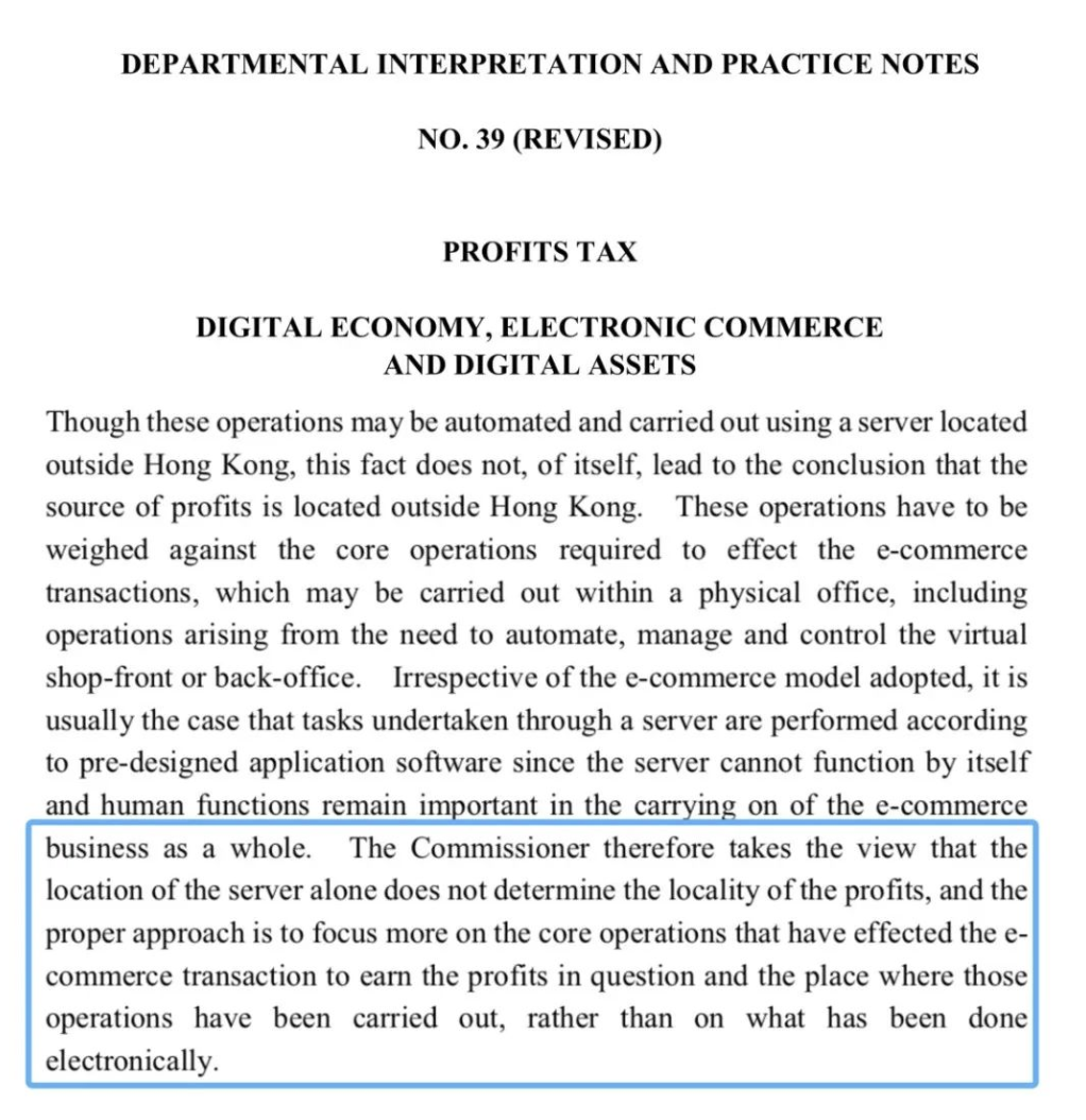 對(duì)此,香港稅務(wù)局于2020年更新了經(jīng)修訂的DIPN 39中的某些規(guī)則。明確了判斷標(biāo)準(zhǔn):如果主要核心操作在服務(wù)器中進(jìn)行,它將被視為永久性機(jī)構(gòu)(常設(shè)機(jī)構(gòu)),認(rèn)定其核心業(yè)務(wù)仍在香港執(zhí)行,需要繳納稅款。